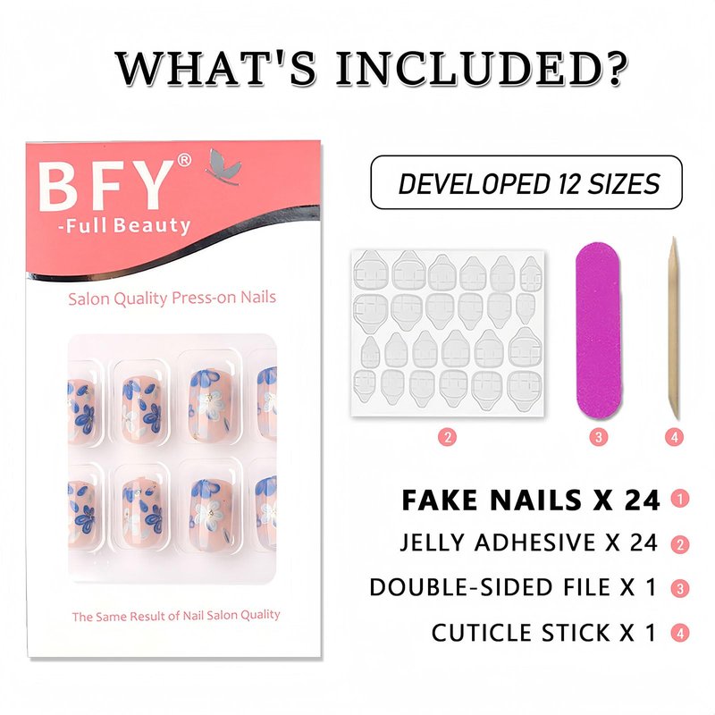 - 【BFY Press Manicure Set】-- The nail set contains 24pcs press on nails, 1* nail file, 24* jelly gum, 1* cuticle pusher. Get salon-like manicures with no need for gel polish and UV lamps.