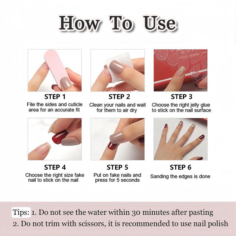 3.Keep away from water within 1 hour after applying fake nails.