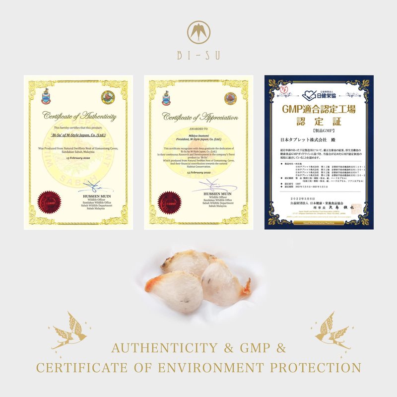 - 【100% Natural Ingredient & Extraction Technology】 BI-SU uses "100% NATURAL SWIFTLET’S NESTS", which contains plenty of nutrients that your body needs, and essentials for your beauty routine. Swiftlet's nest has exceptional high concentration in "SIALIC ACID". We collect "SWIFTLET'S NESTS" that are strictly controlled by Malaysian government and use our own exclusive extraction technology to obtain high-quality essence to deliver the best possible healthy, anti-aging effect to you.