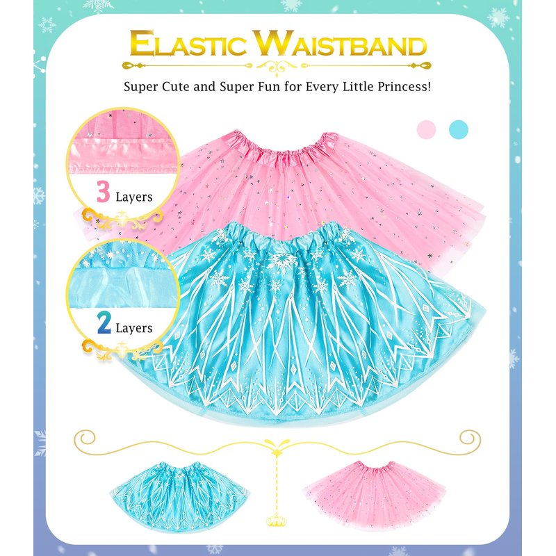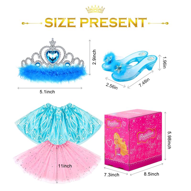 - Girls Dress Up Gift: Girls dress up costumes for play with 2 sets of matching princess crowns for little girls, tutu skirts and princess shoes in very nice box. Toddler dress up clothes for girls, super cute and super fun for every little princess! Does your little girl love to walk in shoes that have heels? This is a great gift for your little one cause she no longer walks in mom's high heels.