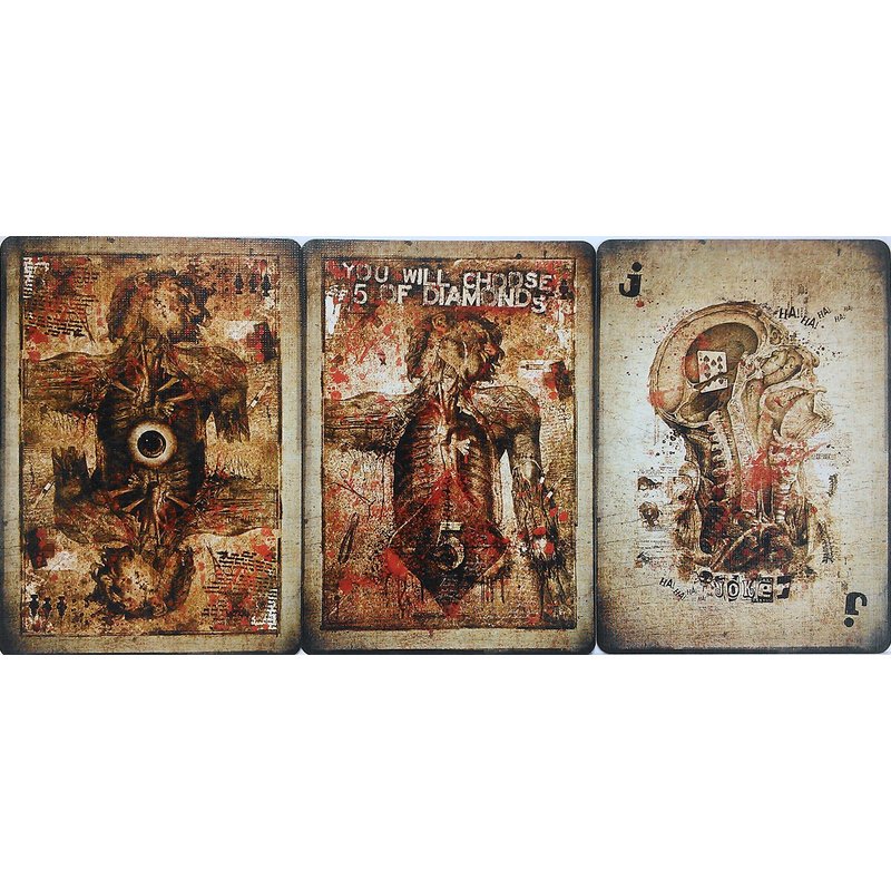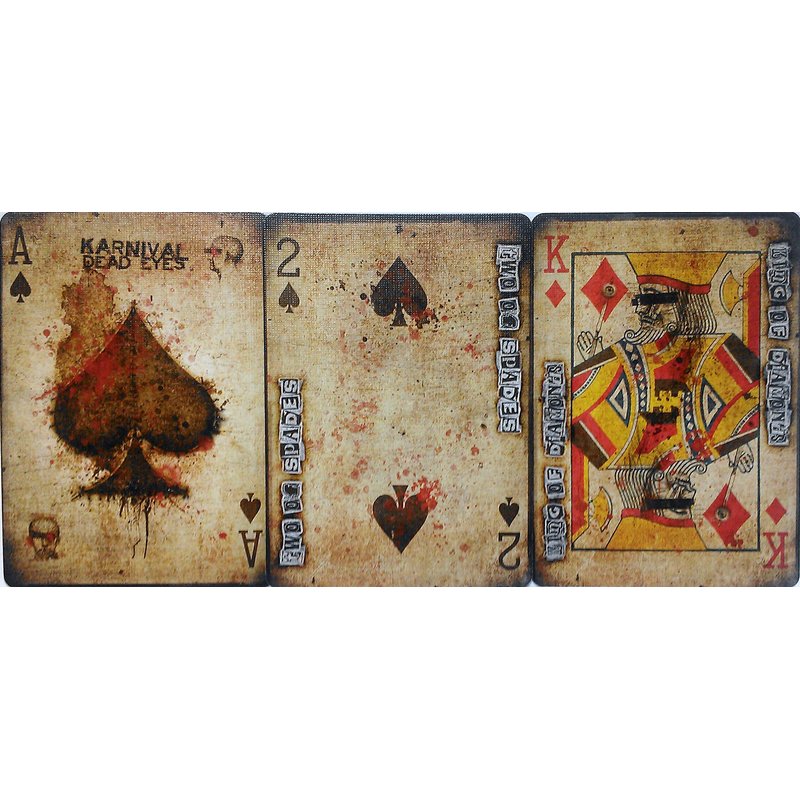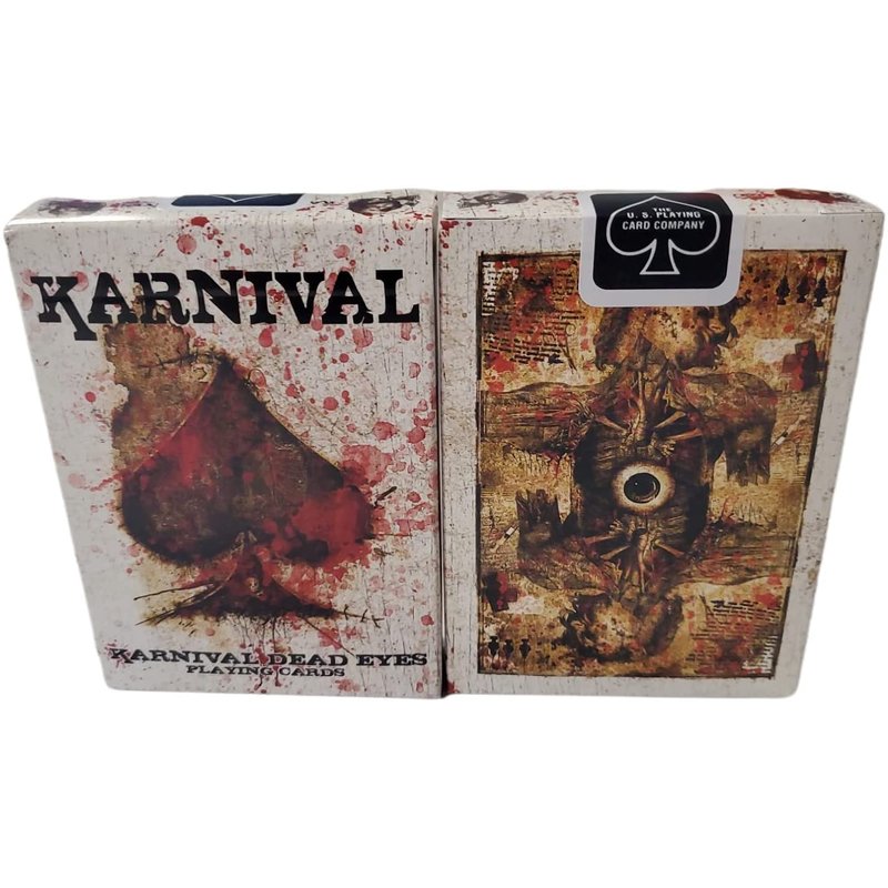The incredibly popular Karnival range of playing cards reaches new heights of eye-popping design with the KARNIVAL DEAD EYES. Inspired by gothic medical imagery and the world of serial killers, the deck features 56 beautiful pieces of artwork. Every single card has been painstakingly crafted by master designer Sam Hayles - from the blood splattered court cards to the aged and distressed jokers. The Karnival Dead Eyes are a beautiful yet macabre spectacle. The entire deck has been designed - the faces of every card are in keeping with the theme and feel of the deck - in stunning full color! The value of each card is printed down it's left and right hand side (so it can be clearly read in a ribbon spread). You get the world famous USPCC Air Flow Finish for superb handling and unparalleled durability. All Karnival Decks are manufactured exclusively on Bicycle's sheet fed press for a higher quality product! A beautifully realised card reveal on one of the jokers - (a Ten of Spades appears inside the skull). A bonus card with the message 'You will choose the Five of Diamonds' emblazoned across it. A blank faced card to use in your magic routines.