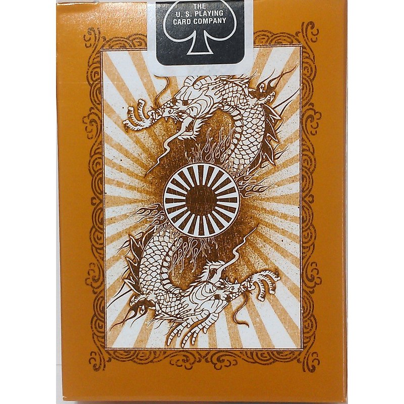 Taking a new turn from the previous custom decks in their series, Big Blind Media produced the Karnival Ryujin which boasts oriental styled imagery in gold metallic ink. The metallic gold ink has also been used on the court cards, replacing what is usually yellow on the standard faces. The cards have very subtle one-way backs. Comes with two custom jokers (one of which features a reveal), a custom Ace of Spades, a blank faced gaff card, and an ad card with a reveal/prediction printed on one side.