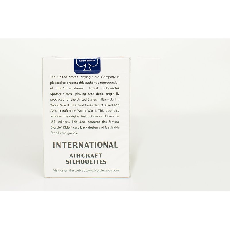 Two decks, one red and one blue. We are pleased to offer this pack of authentic reproduction "International Aircraft Silhouette Spotter Cards," originally produced for the United States military in 1942. Box includes instruction card and two jokers, sealed, and cellophane wrapped. These are genuine Bicycle brand playing cards produced in the USA by the United States Playing Card Company from their original plates. These cards feature silhouette images of Allied and enemy aircraft in use during WW II. These decks were designed to be entertaining as well as educational. The images depict a front, side and bottom silhouette of the aircraft, the view ground observers would be most likely to see.