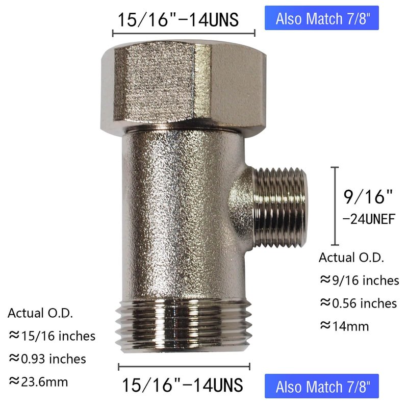 - T-Adapter Thread Size: Standard thread 15/16"-14UNS x 15/16" x 9/16"-24UNEF. Also been known as 7/8" compression inlet x 7/8" compression outlet x 9/16"compression outlet. The 7/8" ballcock thread is 7/8"-14UNS