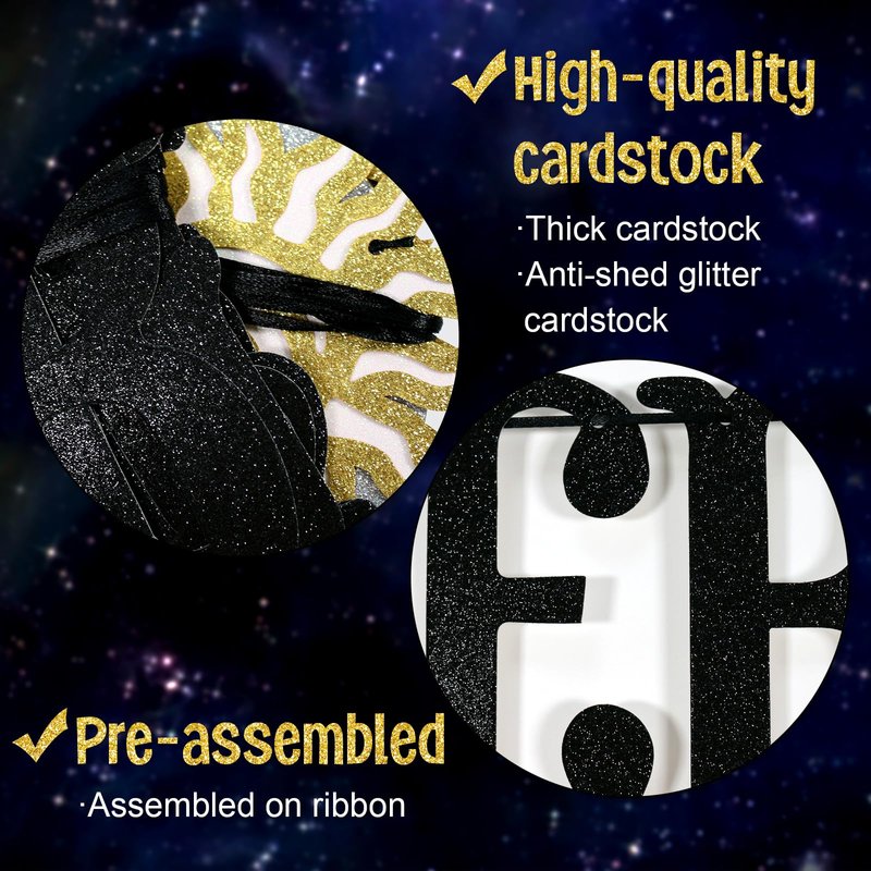- Premium Material: Made of glitter cardstock. High-quality, sturdy and reusable. The banner arrives PRE-STRUNG on black twine.