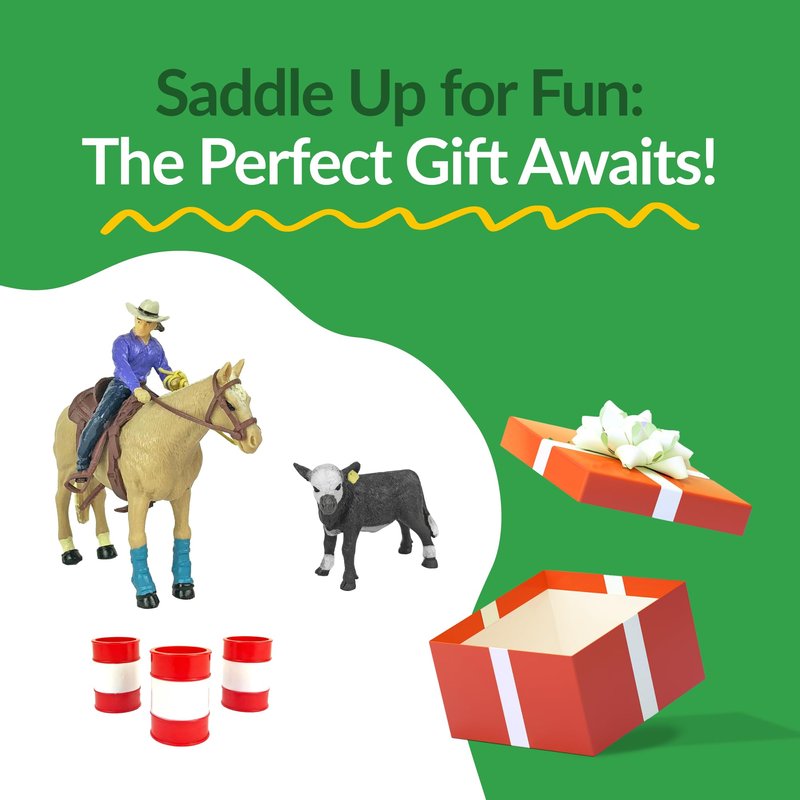 - Durable Cowgirl Toy Set: Made of our proprietary blend of child-safe plastic that creates durable, lifelike figurines and cowgirl toys for kids 3 years and up. Inside you'll find 3 toy barrels, a Palomino Quarter toy horse, a cowgirl figurine toy, saddle, tack and roping calf.