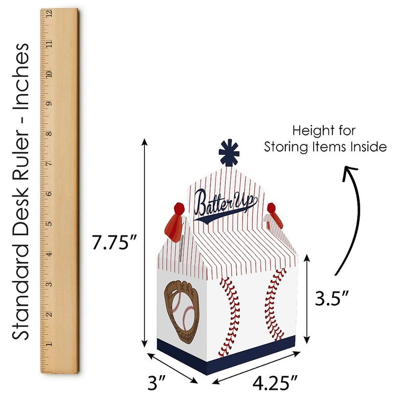 - Gable Boxes INCLUDE: 12 Batter Up - Baseball-themed goodie party favor boxes. Each box SIZE measures 4.25 inches length x 3 inches width x 7.75 inches height. Gable favor boxes are ideal for small gifts and treats that are under 3.5 inches tall (height for storing items in closed box).