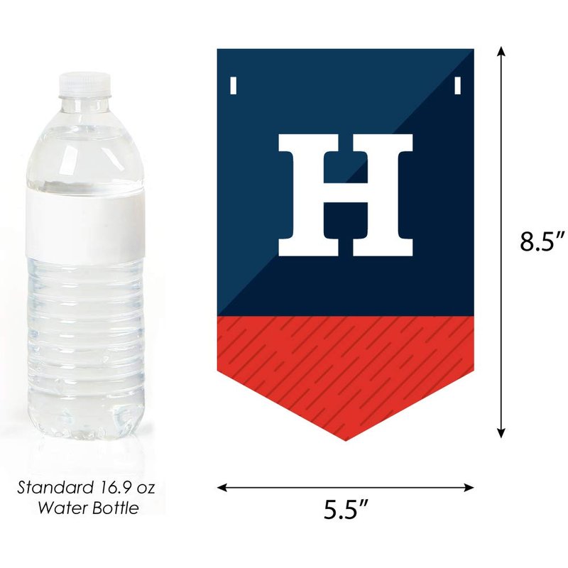 - Birthday Party Bunting Banners SIZE: Each pennant measures 8.5 inches high x 5.5 inches wide. Ribbon measures 24 feet long and 3/8 inch wide.