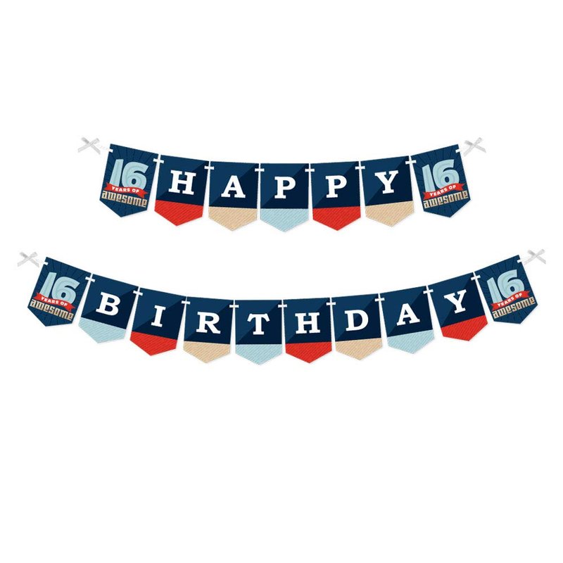 - Boy 16th Birthday Bunting Banner is an impressive birthday decoration for your party. Birthday Bunting Banner Decoration Kit INCLUDES HAPPY BIRTHDAY letter pennants, sixteenth themed pennants, satin ribbon and non-marking wall mounts for hanging.