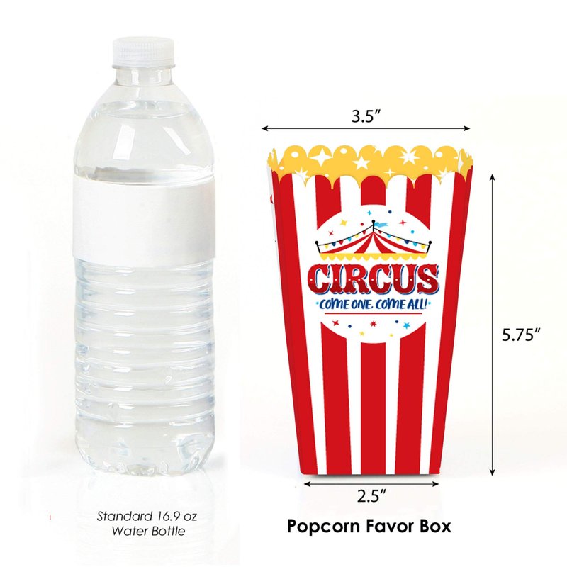 - Carnival - Step Right Up Circus party favor popcorn treat boxes SIZE 5.75 inches tall x 3.5 inches square at the top. The unique design and large size makes these 12 circus popcorn boxes a must-have for any baby shower or birthday party.