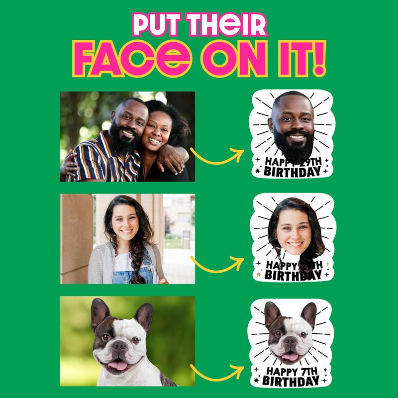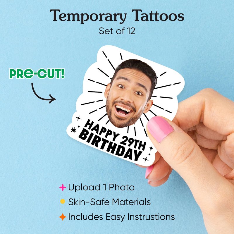 Say hello to our vibrant and awesome Adult Happy Birthday Fun Face Temporary Tattoos! Whether you’re looking to add some flair to your look or getting ready for an unforgettable Happy Birthday Party, these fake tattoos are the perfect way to make a statement without the commitment of permanent ink! Plus, with the text and photo customization, you'll be rocking a pic of your guest of honor that'll have everyone talking! The Adult Birthday tattoos are pre-cut and printed on skin-safe material. Easy to use, make sure your skin is clean and dry before applying the tattoo with a damp cloth. Then, let your tattoo dry before showing it off to the world! From celebrating the guest of honor to making fun memories, our tattoos are here for a good time, not a long time. So, gather your crew and get ready to bring to party to life with our birthday custom photo temporary tattoos!