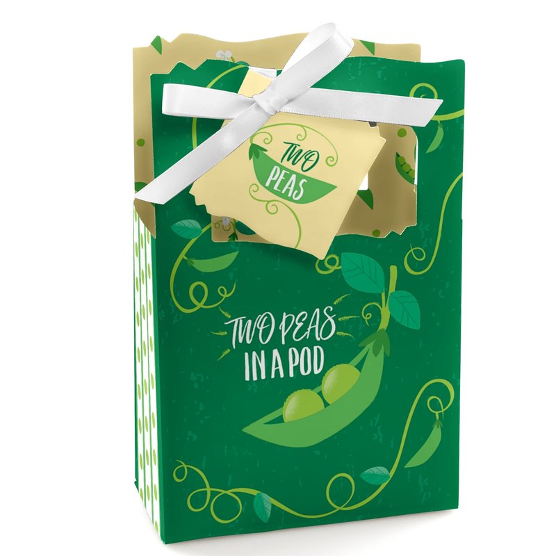 - Double the Fun - Twins Two Peas in a Pod Favor Boxes INCLUDES 12 twins party favor bags, 12 gift tags and coordinating satin ribbon. Classic favor boxes are a party must-have. Twin theme party supplies are great for a baby shower or birthday party.