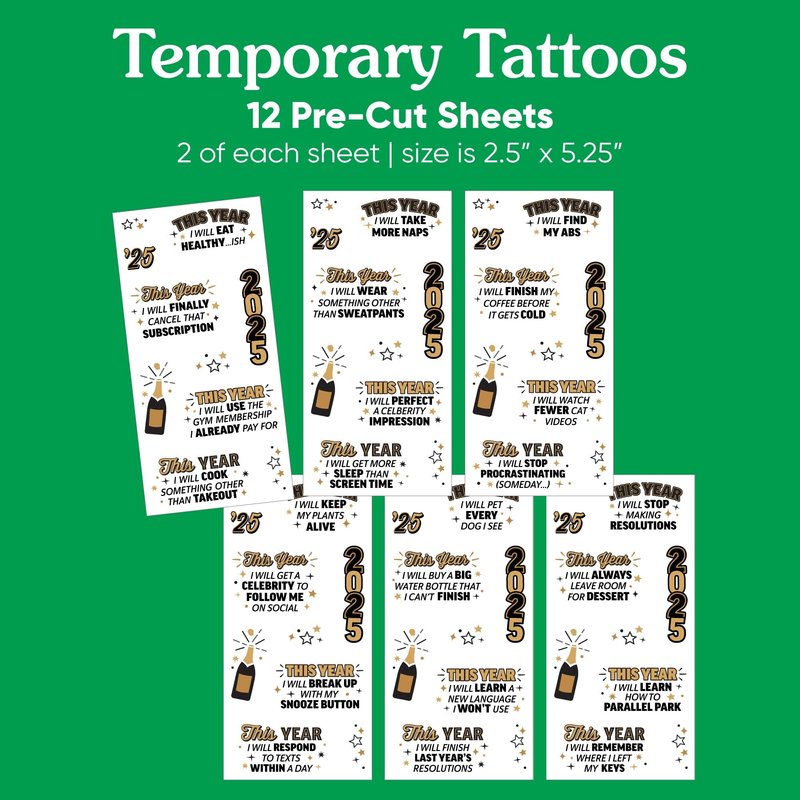 - High-Quality New Year's Eve Party Supplies: The resolution tattoo sheets are pre-cut and professionally printed on skin-safe material. They will arrive party-ready!