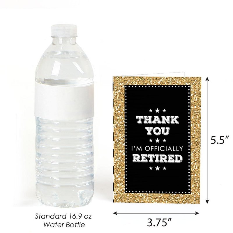 - Happy Retirement Thank You Note Card Set INCLUDES 8 black and gold party thank yous and premium white envelopes. Retirement thank you notes are perfect for any event.