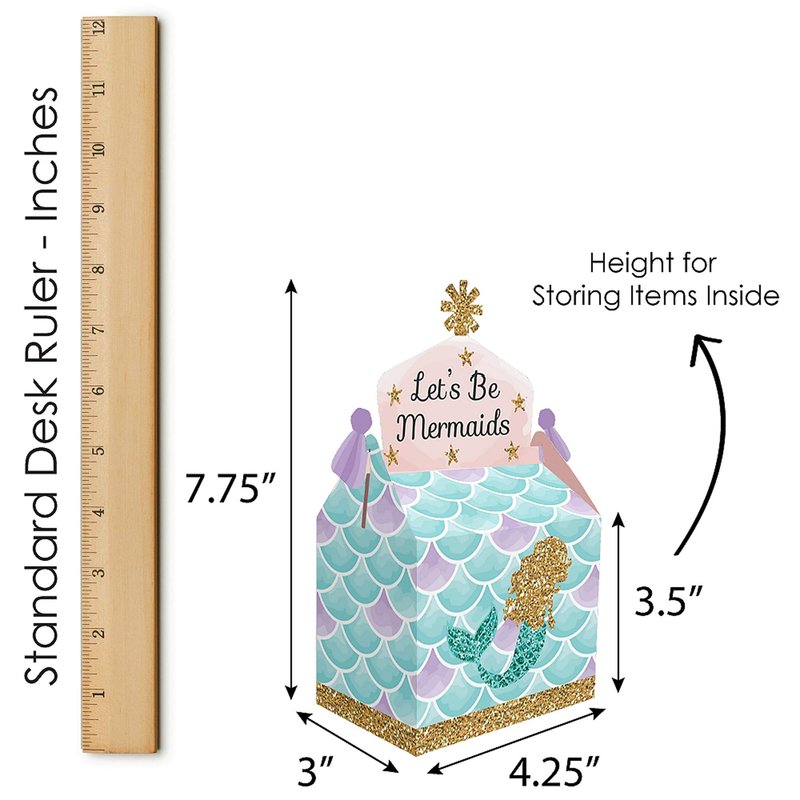 - Gable Boxes INCLUDE: 12 Let’s Be Mermaids-themed goodie party favor boxes. Each box SIZE measures 4.25 inches length x 3 inches width x 7.75 inches height. Gable favor boxes are ideal for small gifts and treats that are under 3.5 inches tall (height for storing items in closed box).