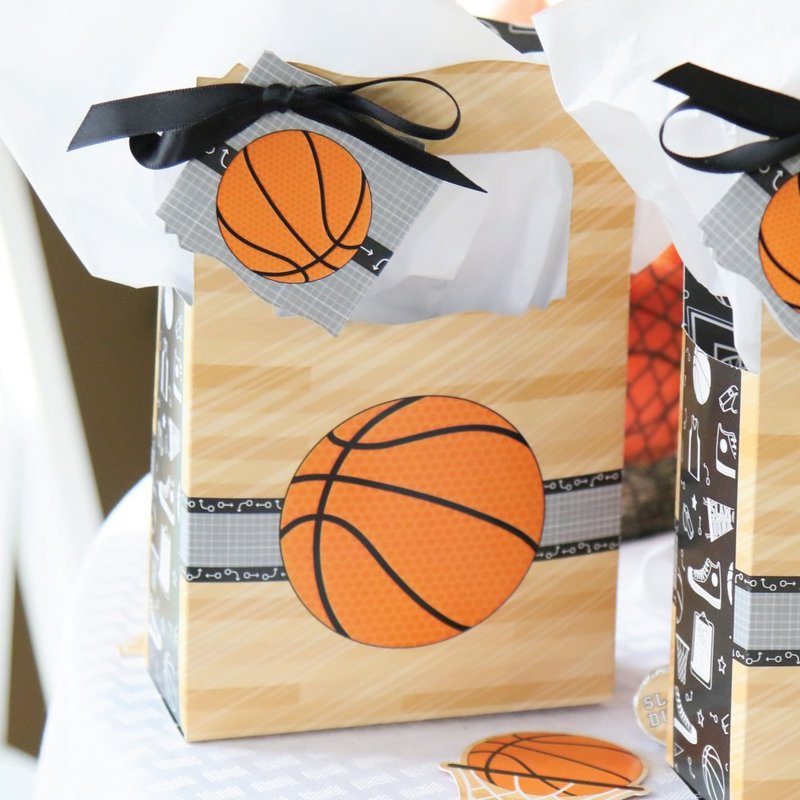 - Nothin’ But Net Favor Boxes INCLUDES 12 basketball party favor bags, 12 gift tags and coordinating satin ribbon. Classic favor boxes are a party must-have. Basketball theme party supplies are great for a baby shower, birthday or graduation party.