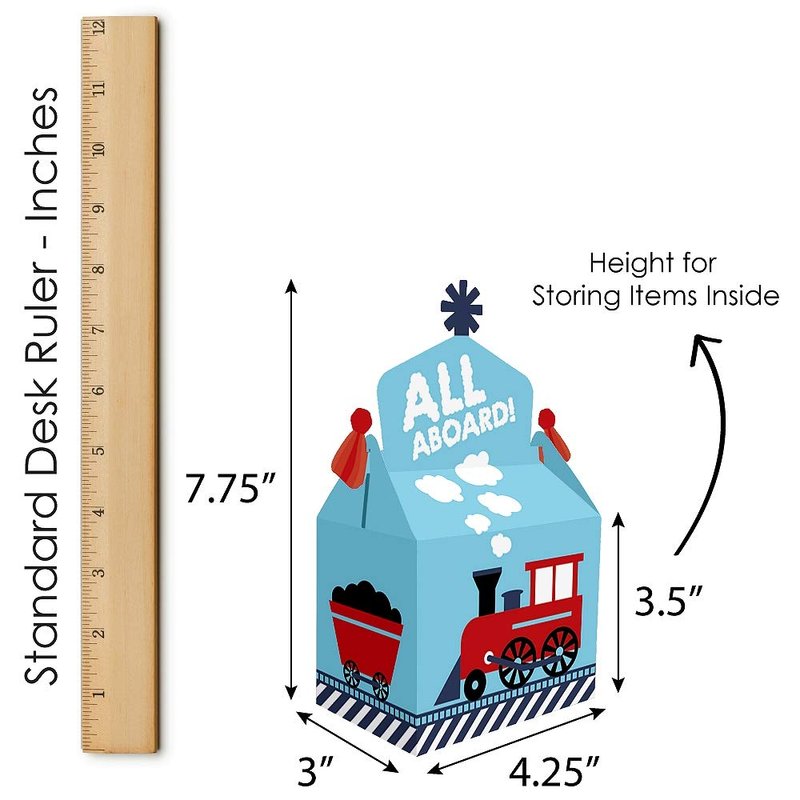 - Gable Boxes INCLUDE: 12 Railroad Party Crossing-themed goodie party favor boxes. Each box SIZE measures 4.25 inches length x 3 inches width x 7.75 inches height. Gable favor boxes are ideal for small gifts and treats that are under 3.5 inches tall (height for storing items in closed box).