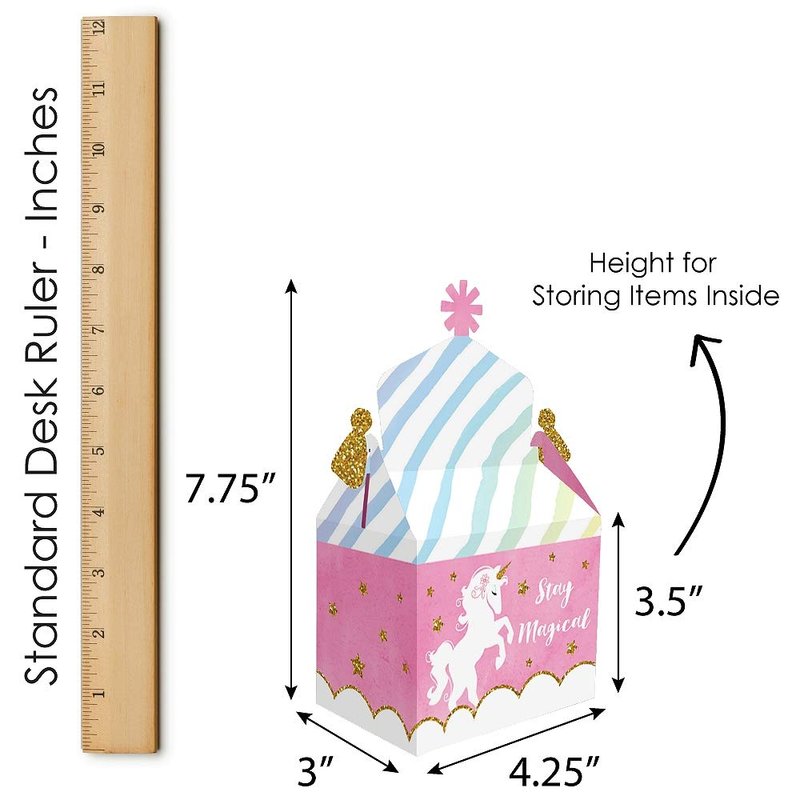 - Gable Boxes INCLUDE: 12 Rainbow Unicorn-themed goodie party favor boxes. Each box SIZE measures 4.25 inches length x 3 inches width x 7.75 inches height. Gable favor boxes are ideal for small gifts and treats that are under 3.5 inches tall (height for storing items in closed box).
