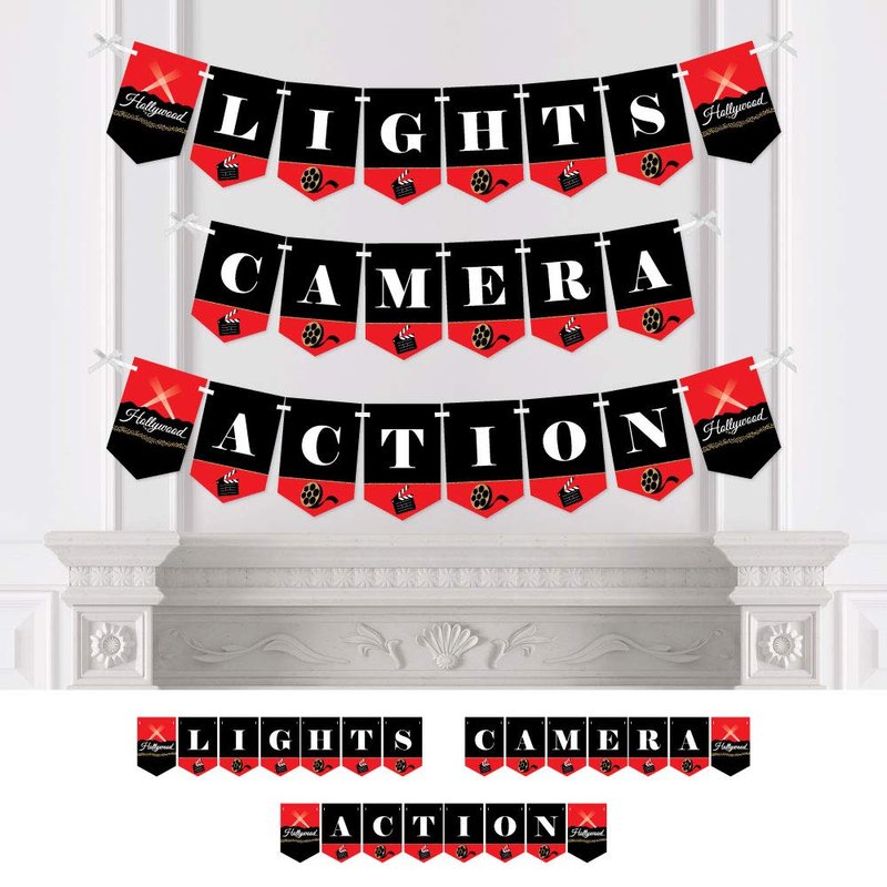 - Red Carpet Hollywood Bunting Banner is an impressive prom, homecoming, bachelorette or birthday party decoration for your party. Red Carpet Hollywood Bunting Banner Decoration Kit INCLUDES LIGHTS CAMERA ACTION letter pennants, Hollywood themed pennants, satin ribbon and non-marking wall mounts for hanging.