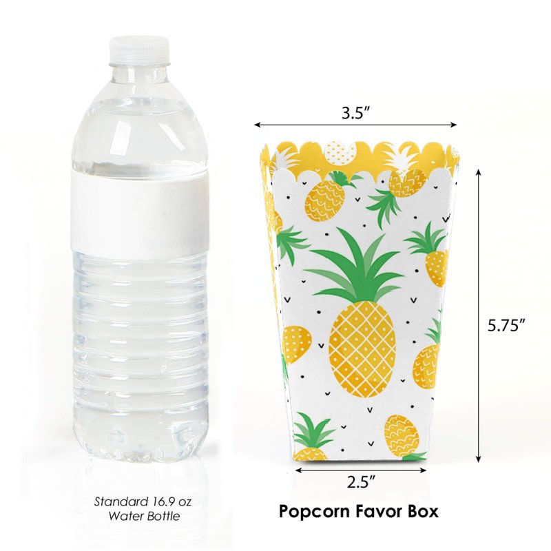- Tropical Pineapple favor popcorn treat boxes SIZE 5.75 inches tall x 3.5 inches square at the top. The unique design and large size makes these 12 gold pineapple popcorn boxes a must-have for any summer party.