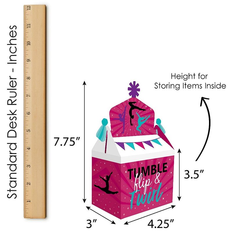 - Gable Boxes INCLUDE: 12 Tumble, Flip and Twirl - Gymnastics-themed goodie party favor boxes. Each box SIZE measures 4.25 inches length x 3 inches width x 7.75 inches height. Gable favor boxes are ideal for small gifts and treats that are under 3.5 inches tall (height for storing items in closed box).