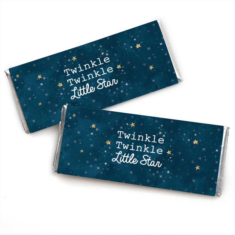 - Twinkle Twinkle Little Star Standard Candy Bar Wrapper Kit INCLUDES 24 chocolate bar wrappers and 24 foils, perfect for styling an adorable blue and gold star candy buffet or unique Twinkle Twinkle Little Star baby shower or birthday party favors.