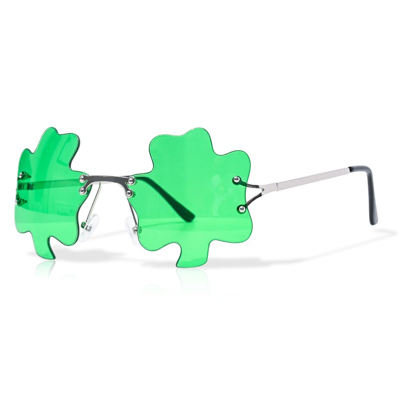 - 1 pair of Irish Rimless shamrock sunglasses as featured, with a silver metal frame.