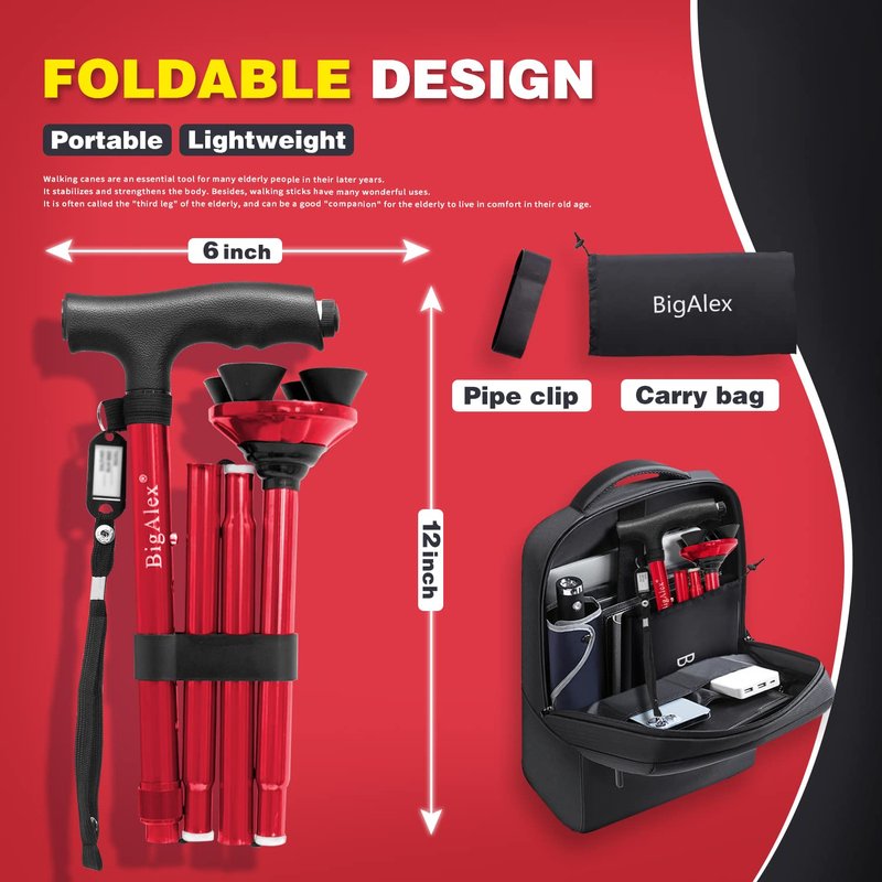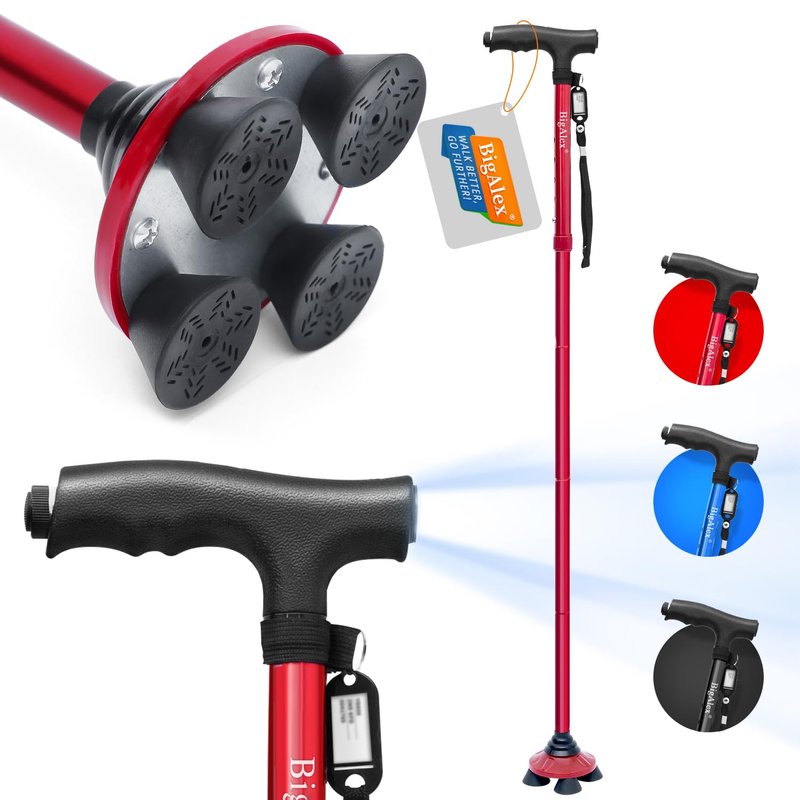 BigAlex Folding Walking Cane with LED Light,Pivoting Quad Base,Adjustable Walking Stick with Carrying Bag for Men/Women