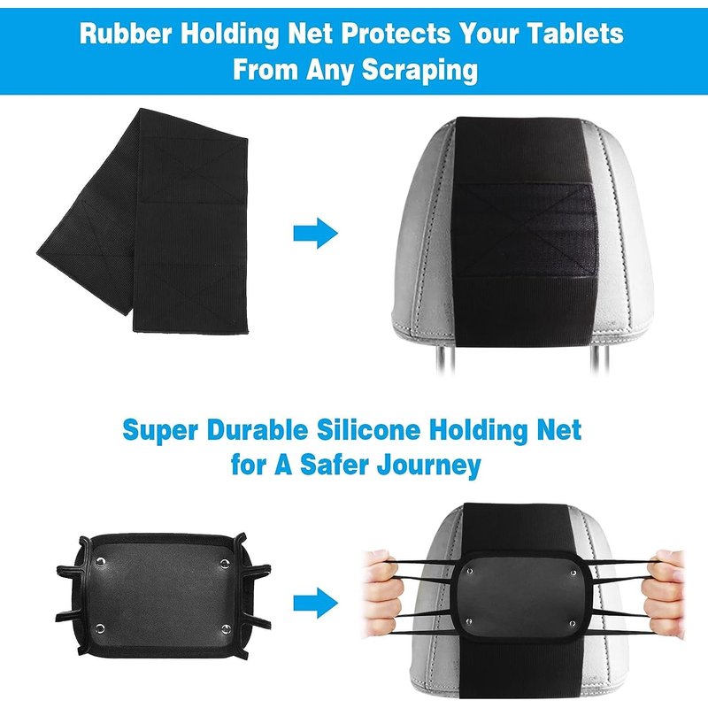 - đ ăSturdy and SafeăAdjustable Tablet Holder for Car Back Seat is made of durable and safe material, elastic velcro can stick to your back seat firmly, silicone strip fixing net helps to securely hold your tablet and protect your device from scratches, and there is no need to worry about dropping the tablet while driving even on rough and bumpy road conditions.