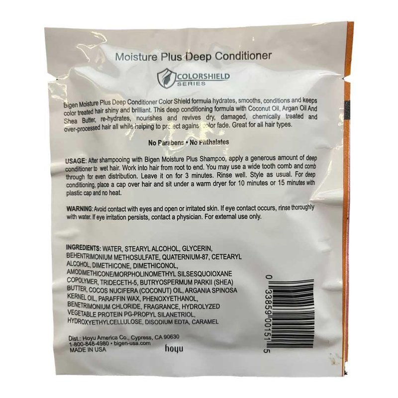 Bigen Moisture Plus Deep Conditioner is intensely moisturizing, quick detangling, and leaves color treated hair smooth, shiny, and brilliant. This deep conditioning formula with Coconut Oil, Argan Oil and Shea Butter rehydrates, nourishes and revives dry, damaged hair. Protects hair from breakage and color fading. Great for all hair types. No SLS / SLES, No Parabens.