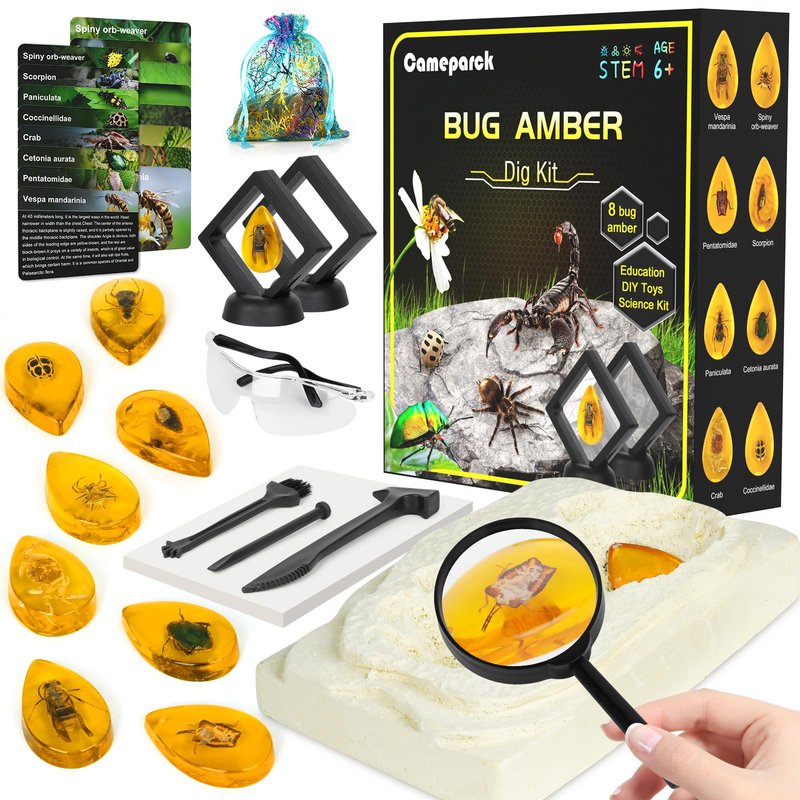 Cameparck Amber Dig Kit-Excavate 8 Artificial Insect Resin Specimens,Educational Science Kits Toys for Bugs Collection,Great STEM Science Kits Gift for Kids Age 6 7 8 9 10 11 12 Years Old Boys & Girls