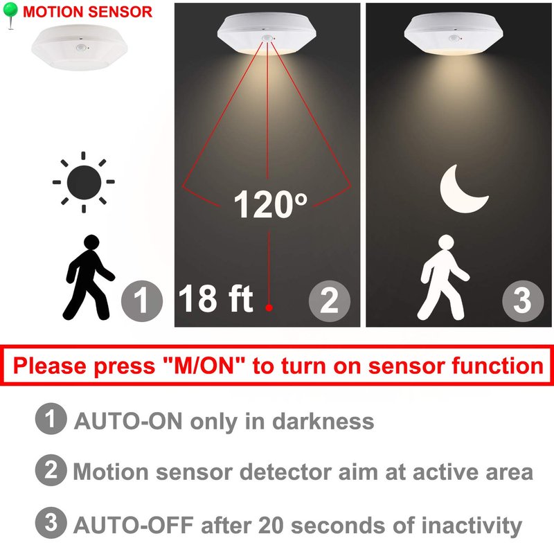 - 【MOTION/LIGHT SENSOR】— Last longer lifetime and keep more energy saving. The motion detector distance is within 18 feet . Turn ON motion sensor function by RF remote when use motion detector. Please Press the key "M/ON" for ON, and "M/OFF" for OFF. The red indicator light will flash when the motion sensor is working.