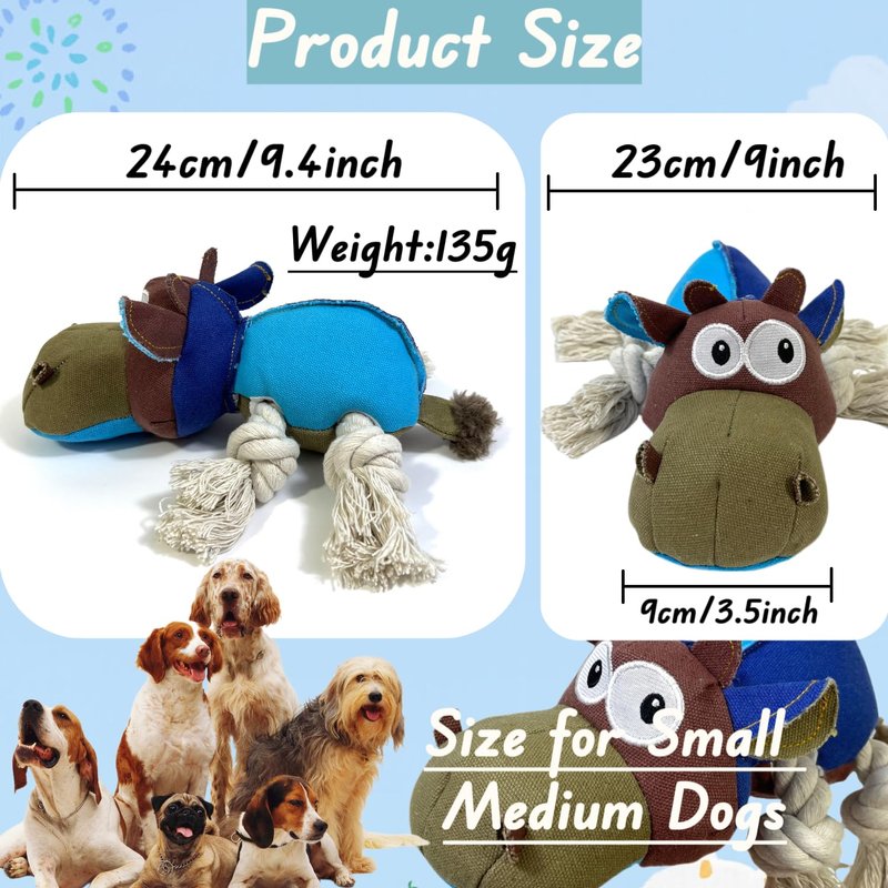 Features: 1.Plush Dog Toys for Teeth Cleaning: Delight your furry friend with the BIKIISEN interactive dog toys for boredom, a tiny canvas cow design that keeps your pup busy and engaged. Ideal for puppies, it effectively cleans teeth and maintains healthy gums. The top layer is made from upgraded cozy canvas and the inner layer is made from Oxford cloth, it boasts thicker, sturdier fur and seams, plus natural cotton filling for superior safety, comfort, and softness, ensuring long-lasting durability. Perfect for small to medium-sized dogs of all ages. 2.Squeaky & Crinkle Dog Toys: Ignite your dog's curiosity and attention with the BIKIISEN tough dog chew toys, featuring a squeaky canvas cow body. With two retractable cotton ropes, you can tug with your pups easily. This dog toy to keep them busy helps burn energy, reducing anxiety and stress. The squeaky boredom breaker stimulates mental alertness and provides psychological guidance, deterring destructive chewing behaviors. Perfect for indoor and outdoor play, it's a great companion for your pup. 3.Interactive Dog Toys: Entertain and mentally stimulate your dog for hours with the uniquely designed BIKIISEN tug of war dog toys. This blue dog toys designed with your dog’s favorite color, captivating your pup's attention. This adorable squeaky dog toys, measuring 9.44 inches in length, is ideal for interactive play, tug-of-war games, and self-amusement. It's a perfect choice for bonding with your beloved pet. 4.Ideal Dog Toys for All Occasions: Make any day special with our funny dog stuffed animals, perfect for birthdays, Christmas, adoption anniversaries, and beyond. From cozy fleece toys for cuddling and naptime to squeaky playthings, we've got everything your pet needs to stay happy and healthy. Our dog birthday toy is especially popular, adding extra joy to your pet's special day. 5.Quality Dog Toys with Care Instructions: Crafted with top-notch materials, our plush dog toy guarantees durability and safety. We offer various interactive small dog toys to stimulate your pup's mind and combat boredom. However, no dog toy is indestructible. We recommend supervising your pet while playing to avoid tears and broken the dog teething toys Why does your dog need us? Gum Massage Teeth Cleaing Grind Teeth Reduce Anxiety & Boredom Avoid Destructive Chewing Interaction & IQ Training Specification: Material: High-quality Pineapple Fleece and Natural Cotton Size: 24cm/9.44inch 23cm/9.05inch 9m/3.54inch Weight: 135 g Package Contents: 1× Canvas Cow Interactive Squeaky Dog Chew Toy