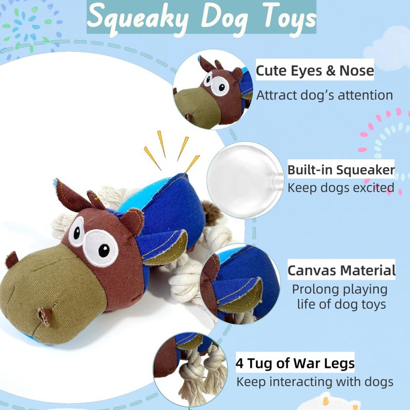 - [Squeaky Dog Toys] Ignite your dog's curiosity and attention with the BIKIISEN tough dog chew toys, featuring a squeaky canvas cow body. With two retractable cotton ropes, you can tug with your pups easily. This dog toy to keep them busy helps burn energy, reducing anxiety and stress. The squeaky boredom breaker stimulates mental alertness and provides psychological guidance, deterring destructive chewing behaviors. Perfect for indoor and outdoor play, it's a great companion for your pup.