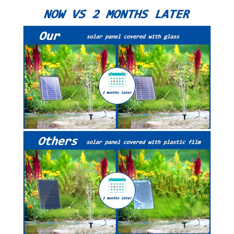 - ECO-FRIENDLY AND RELIABLE SOLAR PANEL KIT: Our solar powered fountain adopts 100% glass solar panels with stronger light transmittance. The solar panel will not oxidize even if used outdoors for a long time, It can steadily absorb the sun's energy and make the water spray more stable and lasting.
