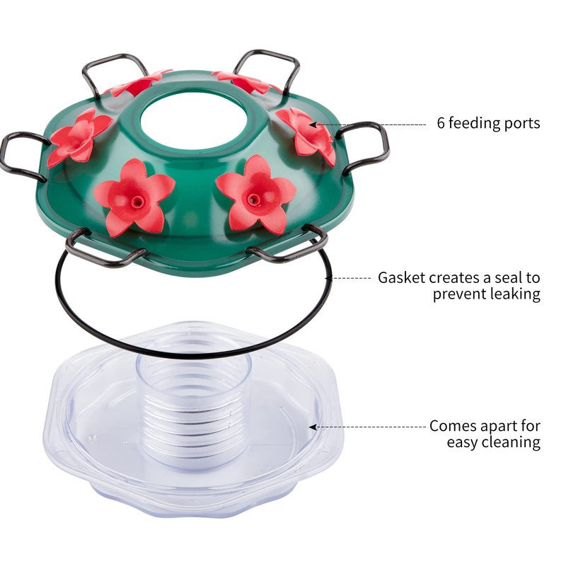 - 6 FLOWER FEEDING PORTS: This Hummingbird Feeder features soft ports and an integrated perch design that optimize the feeding angle and comfort for all species of hummingbirds. The Six ports ensure there’s enough room for multiple birds to dine simultaneously, while the tapered stem design naturally keeps out bees.