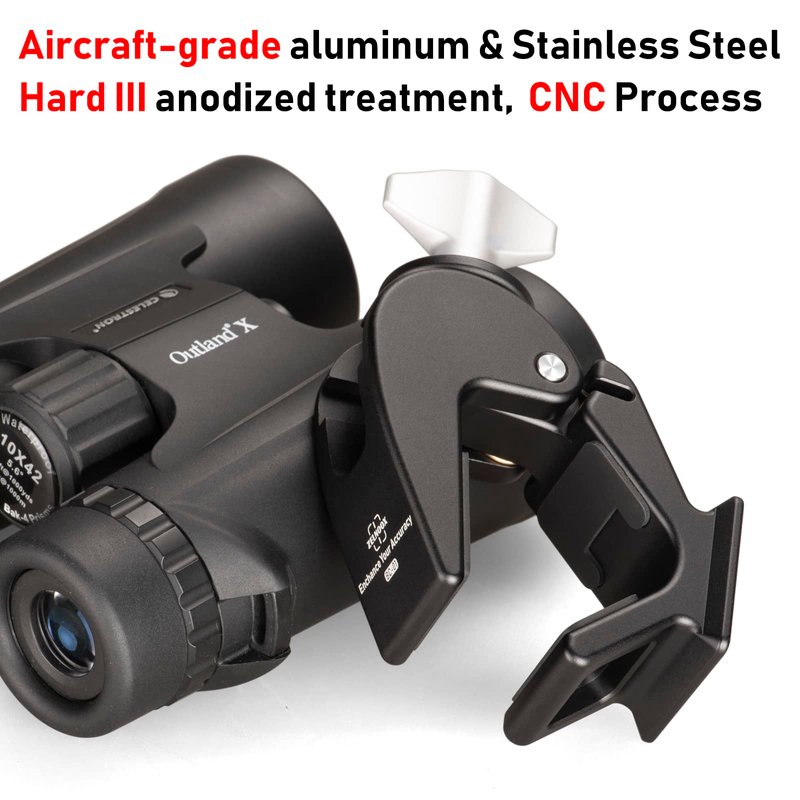 - 【DURABLE】: Precision machined from aircraft grade solid blocks of 7075 aluminum with enough long time anodized treatment for higher durability,the hardware is stainless steel,the inward-angled jaws keep your binoculars in place and are lined with firm rubber, which not only protects the binoculars, but also prevents it from slipping out.