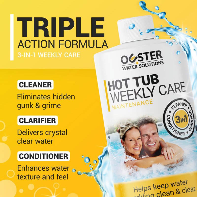 - EASY TO USE: Simply add 2oz of 3-IN-1 Weekly Care for every 500 gallons of water and turn jets on high for 30 seconds. Repeat Ouster 3-in-1 Weekly Care every 7 days thereafter. For best results, use together with Ouster Hot Tub Restoration to deep clean hot tub plumbing, jets, and tubes.