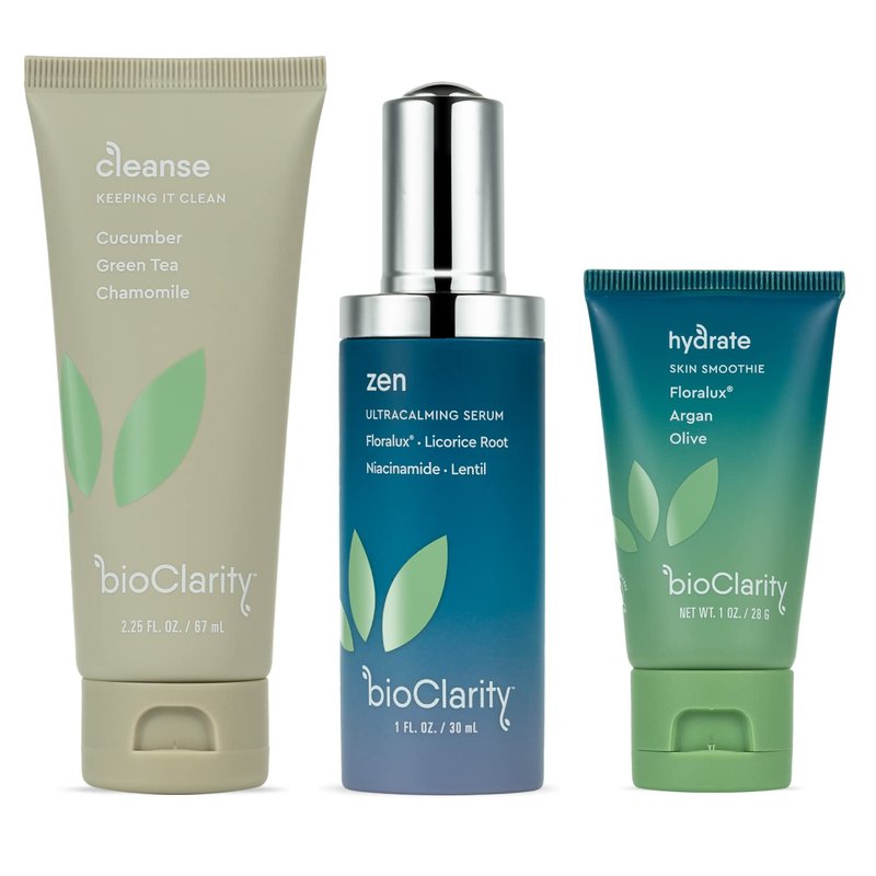 BioClarity 3-Step Ultra Calming Routine for Redness-Prone Skin | 100% Vegan | Gentle Clean and Hydrate Face | Contains Cucuber, Green Tea, Chamomile, Floralux, Vitamin B3, Lentil, Argan, Olive