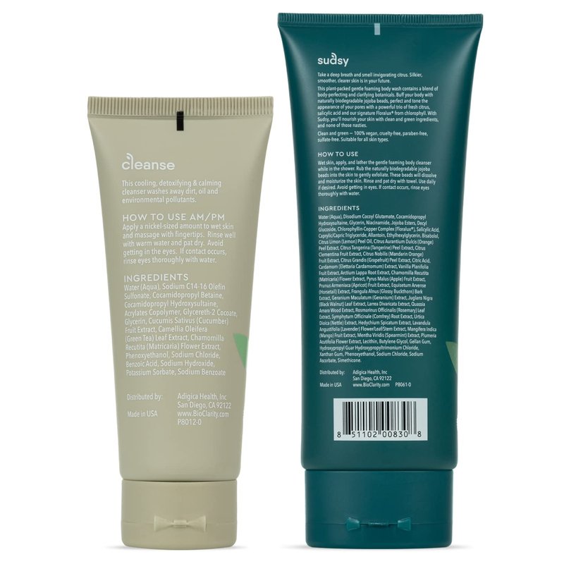 This bundle contains two of our popular products - our 4oz Cleanser + 8oz Sudsy Body Wash. Our Cleanser is our effective yet gentle plant-based foaming facial cleanser contains botanical extracts to help wash away dirt, oil, and environmental pollutants. It’ll leave your skin refreshed and soft. No dry, unhappy skin here. Sudsy is our lathery, bubbly treat that’ll leave you feeling oh so fresh, so clean. Sudsy body wash is chock-full of juicy, body brightening Tangerine, Grapefruit, and Lemon. Buff your body with natural massaging jojoba granules that gently exfoliate and moisturize while lush Floralux and salicylic acid, tone, exfoliate and calm. Treat your body to pure plant perfection. It’s pure plant perfection that’ll leave your body silkier, smoother, buffed, and beautiful. This gentle foaming body wash contains a blend of body perfecting and clarifying botanicals. Earth-friendly jojoba granules gently buff your body and moisturize while Floralux from chlorophyll feeds and defends cells with an alphabet of nutrients to correct and protect, cleanse and calm. Salicylic disrupts breakout cycles by exfoliating as chamomile and apple nourish, tone, and calm. Flood your senses with fresh citrus (orange, lemon, tangerine, mandarin, grapefruit) for a body brightening juicy treat.