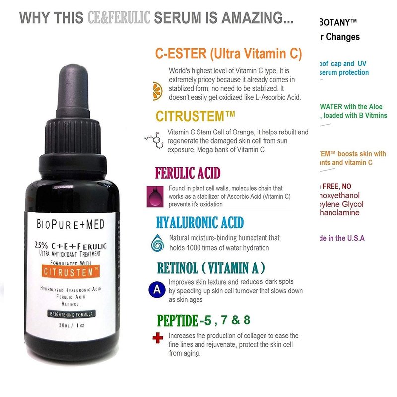 *This newly upgraded Vitamin CE Ferulic Serum with the CITRUSTEM is formulated by a dermatoltogist in Korea and devloped by a chemist in the U.S.A in the strictly regulated laboratory by STEMBOTANY, (the stem cell skin care specialist).