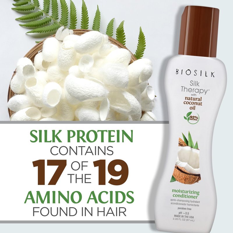 - MOISTURIZING CONDITIONER: BioSilk Silk Therapy with Natural Coconut Oil is specifically formulated to cleanse and nourish while also providing intense moisture to the hair and skin. The formula also helps eliminate frizz & restore manageability.