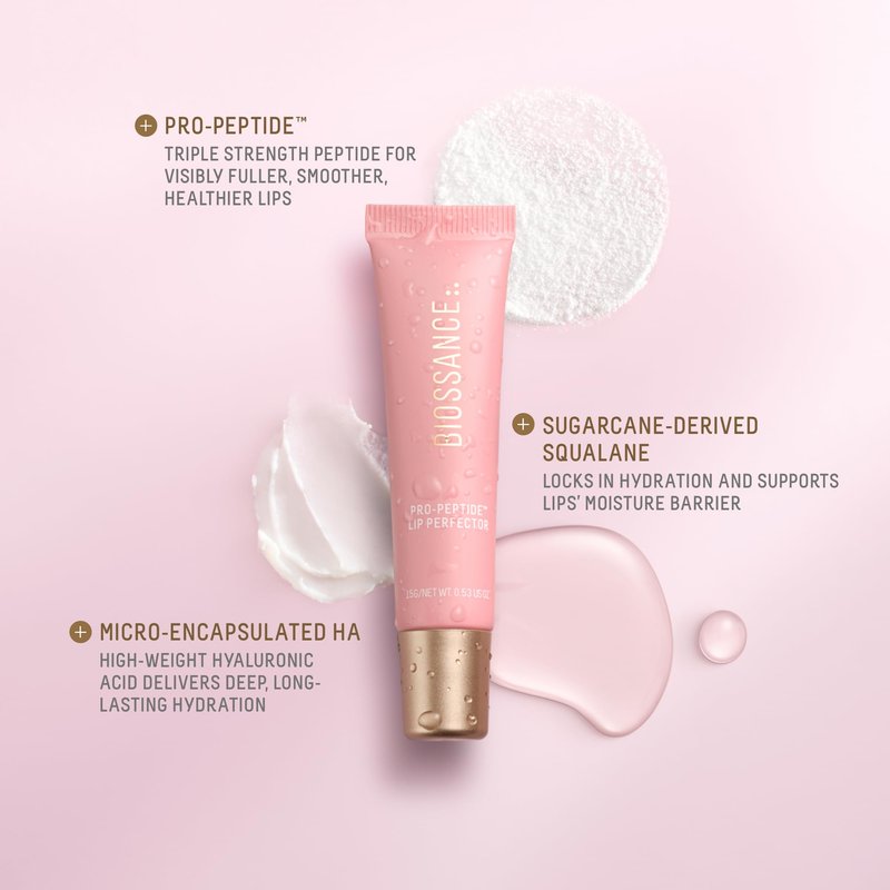 Biossance, Pro-PeptideTM Lip Perfector, squalane + peptides and hyaluronic acid treatment for lips, moisturizing daily lip balm for smooth lips, Blush Quartz - PINK, 1 count