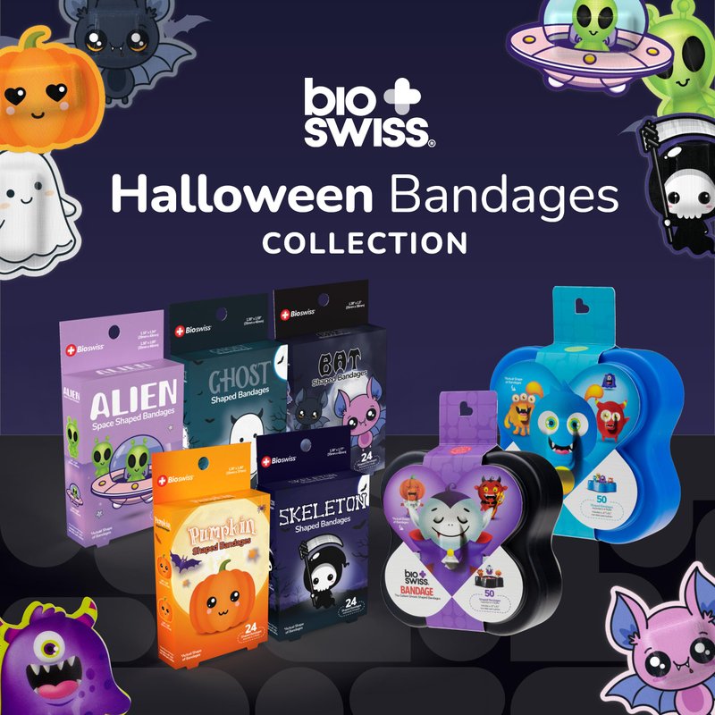 Make no bones about protecting your boo boos and put scary big smiles on the faces of little boys, girls, and even adults with our Halloween skeleton shaped novelty bandages. These skin bandages aid in the treatment of a variety of different wounds, whether it be for a minor cut, burn, scrape, shot injection, blister, and much more. These small size flex bandages feature absorbent, non stick cushion pads which aids in protecting the injury without sticking to the spot of the wound, wrapping comfortably on your arm, leg, face, knee, or even to wrap around your finger tip, and much more. This self adhering bandage pack contains 24 skeleton shaped bandage strips, and are individually wrapped for safe handling, making these childrens bandages great for travel, home first aid kits, school nurses, and pediatric medical practitioners. Our cute and funny junior bandages are composed of sterile, latex free, breathable, and flexible material for reliable long-lasting quality. These boy and girl ghost shaped bandages are perfect for schools and playgrounds, and also make for cute Halloween gifts. Our bandaging supplies are an excellent way to put your child, toddler, or baby at ease, even with a booboo. BioSwiss Halloween bandages are offered in alien, bat, pumpkin, and ghost styles.