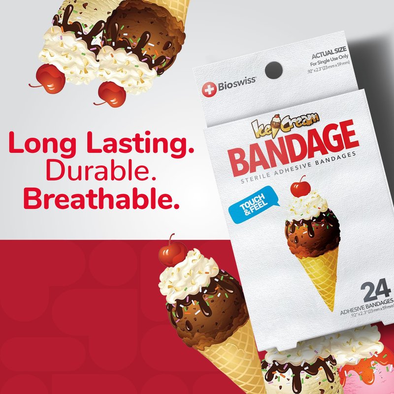 - ICE CREAM BANDAGES: This 24 piece pack of adorable and delicious looking ice cream bandages is great for putting a smile on kids' faces while protecting wounds such as cuts, scrapes, and burns; sticky bandages are perfect for kids and adults alike, and also for school nurses and pediatric doctors