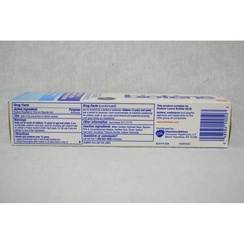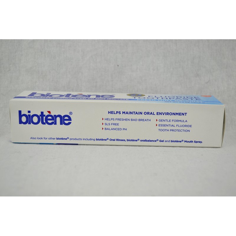 Item Number: 2073070 (1/Tube) - Biotene Fluoride Toothpaste, Fresh Mint Flavor, 4.3 oz Tubes. Formulated to work gently. If you suspect you're one of the millions of Americans with Dry Mouth, your current toothpaste could be worsening the symptoms. By changing your routine and using Biotenes Fluoride Fresh Mint Original Toothpaste twice a day, that unnecessary, additional irritation can be eliminated. It is a simple way to help maintain the health of your teeth without additional irritation. Helps provide essential fluoride protection for Dry Mouth sufferers. Contains no Sodium Lauryl Sulfate (SLS). Gentle with a mild flavor. Active Ingredient: Sodium Fluoride Inactive Ingredients: Water, Sorbitol, Hydrated Silica, Glycerin, PEG-8, Cocamidopropyl Betaine, Xanthan Gum, Flavor, Sodium Saccharin, Sucralose, Titanium Dioxide, Sodium Hydroxide. Biotene products are specifically designed fro Dry Mouth.