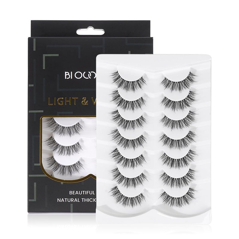Biounce Wispy Natural Faux Mink Cat Eye False Eyelashes 3D Vegan 7 Pairs Full Strip Clear Band (BO22-3), Black