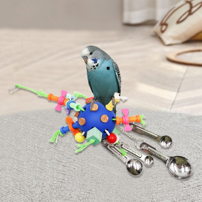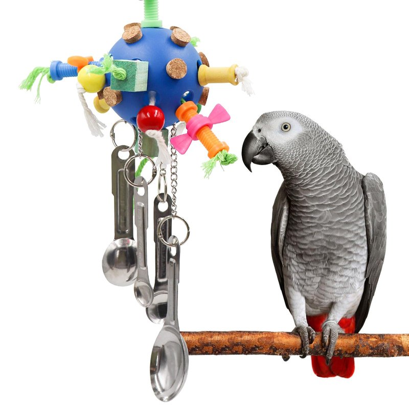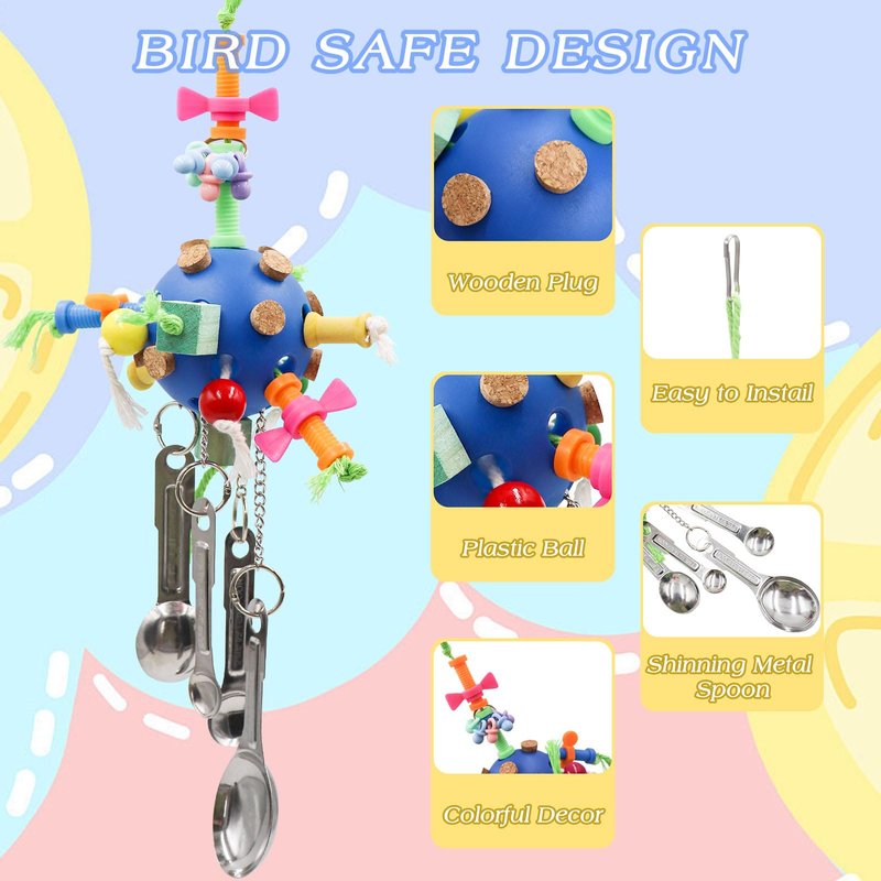 - 【Interactive Design】: Featuring a mix of a colorful plastic ball, wooden accents, and metal spoons, this toy offers an engaging experience that invites play and exploration. It’s perfect for birds who enjoy pecking, chewing, and discovering new textures.