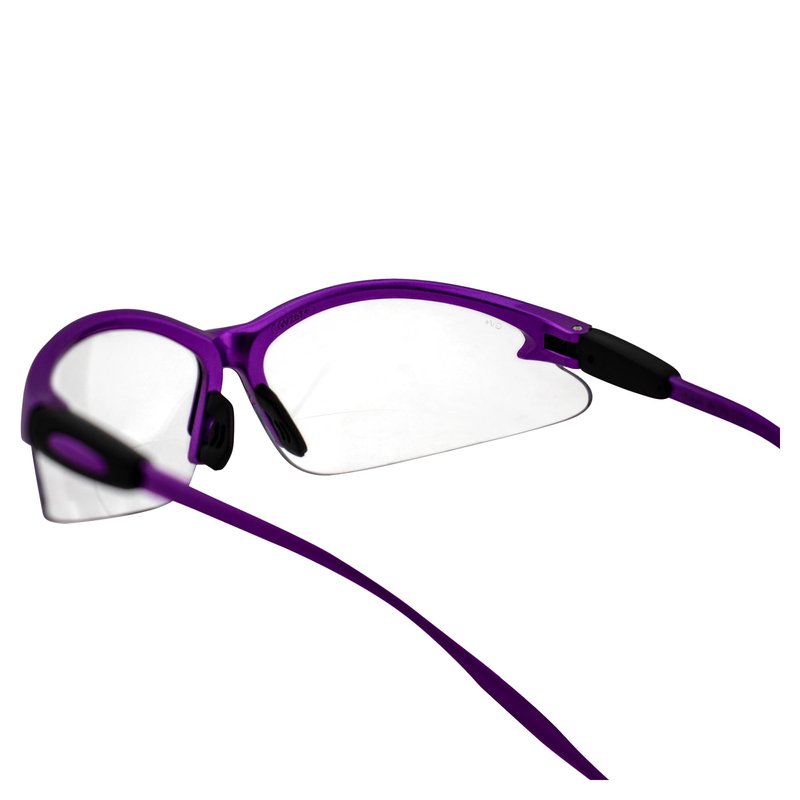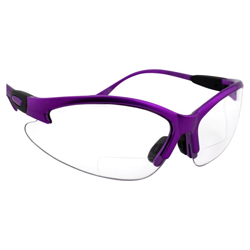 Whether you're in the dentist's office, the shooting range, the laboratory, the operating room, or the woodshop, you need to protect your eyes from whatever your workday shoots your way. From fluids and splatter to dust and debris, our Birdz Eyewear Flamingo Purple Frame Bifocal 2.5 Clear Lens Bifocal Safety Glasses keep your line of sight clear both at a distance and up close. No need to switch out your reading glasses with your necessary safety glasses when your vision needs a little improvement. Stay focused and get the job done without distractions. The shatterproof polycarbonate lenses meet or exceed ANSI Z87.1+ safety standards. Double-sided anti-fog and scratch-resistant coating ensures your lenses stay crystal clear no matter what. The adjustable rubber nose pad provides customized non-slip comfort.