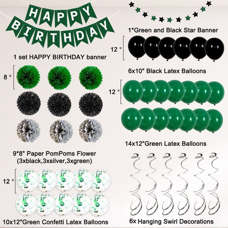 - PREMIUM VALUE PACK: Include 71pcs, 1 set HAPPY BIRTHDAY banner, 9*8" Paper Pompoms Flower(3xblack,3xsilver,3xgreen), 14x12"green latex balloons, 6x12"black latex balloons, 10x12"green confetti latex balloons, 6x silver hanging swirl decorations and 1*green and black star banner, it contains everything that you’ll need in a birthday party and super easy to assemble.
